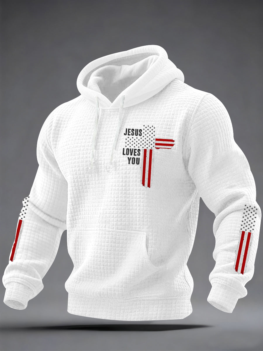 Men's Jesus Loves You Cross Faith USA Flag Print Casual Checkered Hoodie